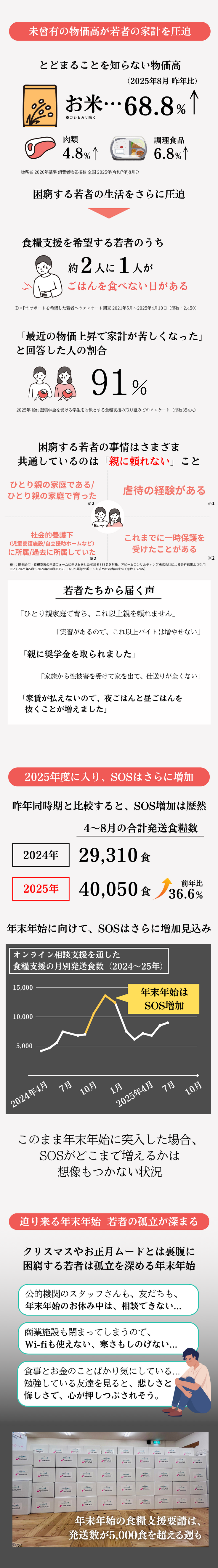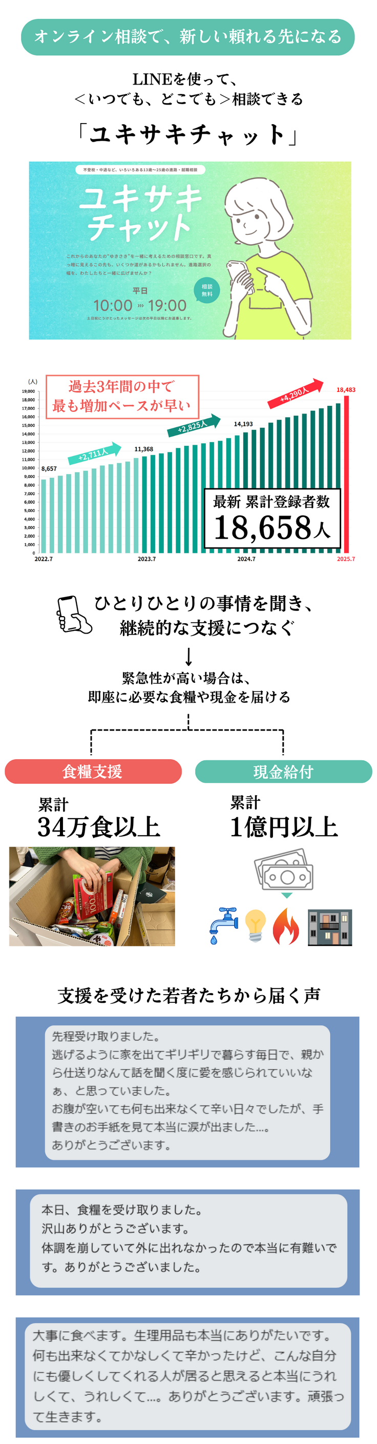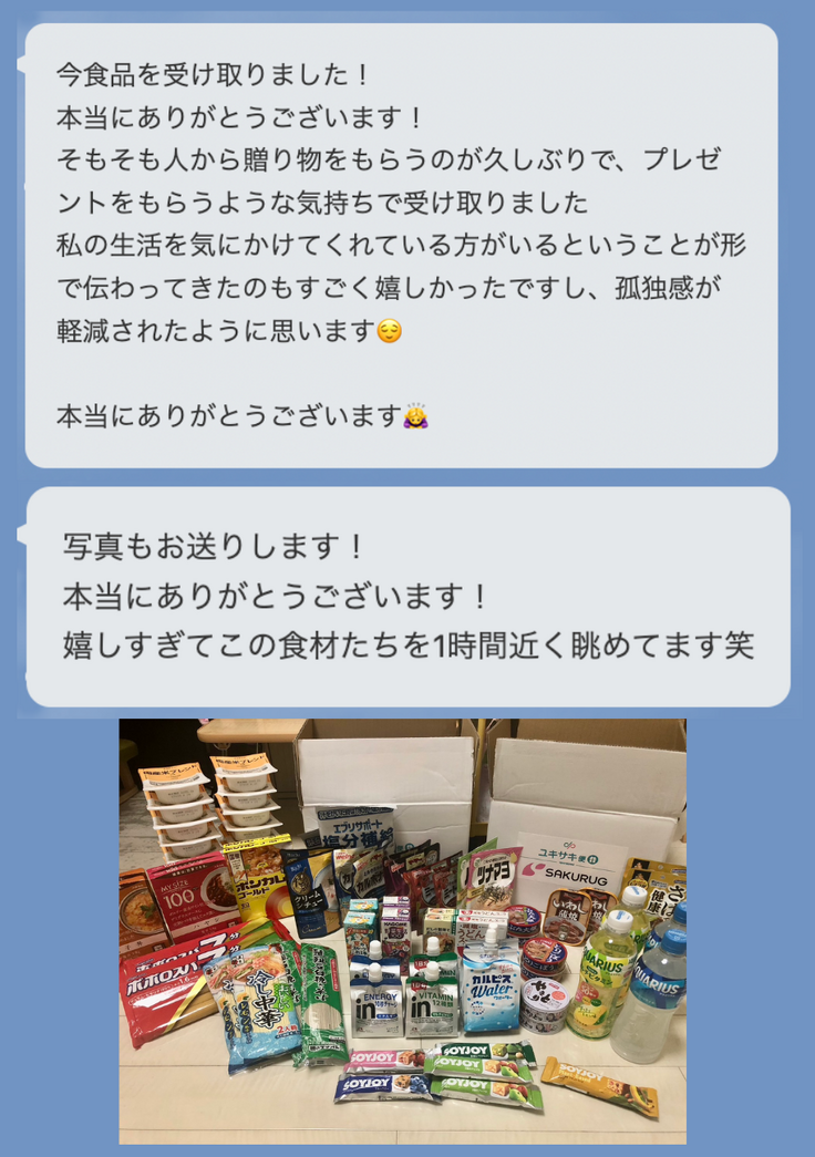 上記の食糧支援・現金給付は、ユキサキチャットで出会った若者の中で、特に厳しい状況の若者に届けるサポートです。
