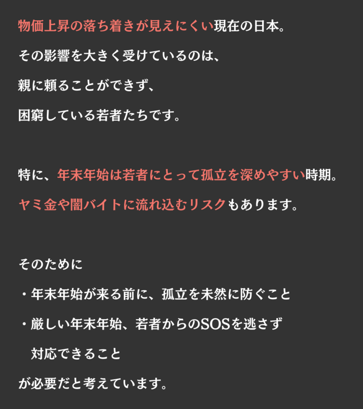 こうした若者たちは年末年始、孤立し食事も満足に取れないことになる。D×Pが進める今回のプロジェクトにぜひ応援してほしい。