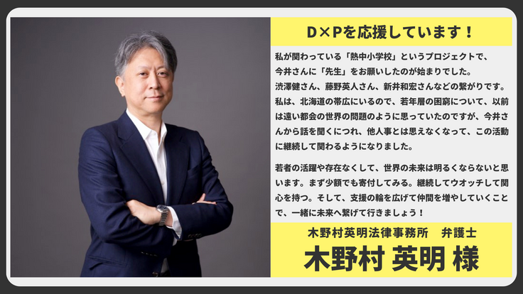 木野村英明法律事務所 弁護士 木野村 英明様から応援メッセージが届きました。ありがとうございます!
