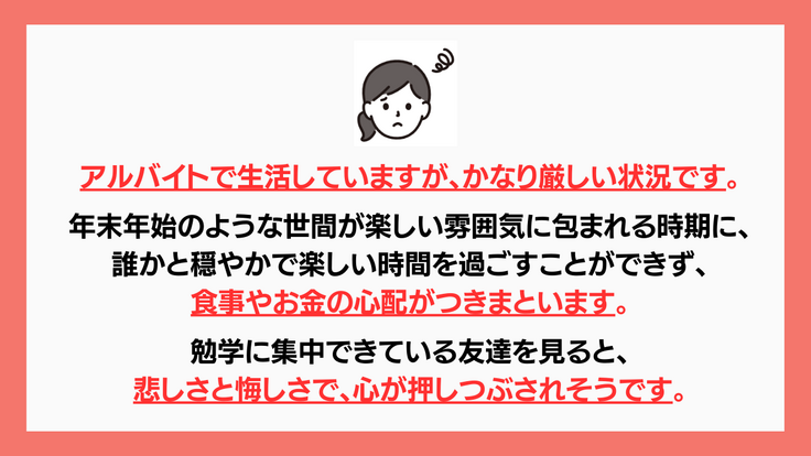 年末年始が迫るこの時期、ユキサキチャットには、若者たちから切実な声が日々届いています。そのすべてをご紹介することは難しいのですが、今回はその中から一部をご紹介させていただきます。