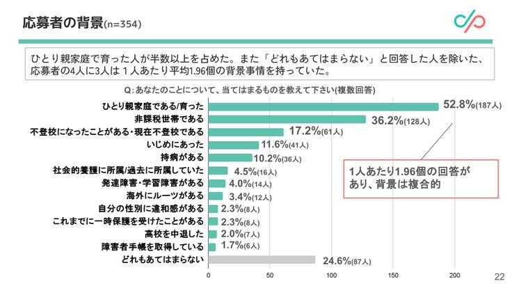 ひとり親家庭で育った人が半数以上を占めた。また「どれもあてはまらない」と回答した人を除いた、応募者の4人に3人は1人あたり平均1.96個の背景事情を持っていた。