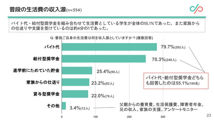 バイト代・給付型奨学金を組み合わせて生活費としている学生が全体の55.1%であった。また家族からの仕送りや支援を受けているのは約4分の1であった。