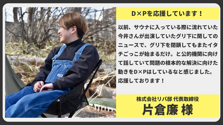 以前、サウナに入っている際に流れていた今井さんが出演していたグリ下に関してのニュースで、グリ下を閉鎖してもまたイタチごっこが始まるだけ。と公的機関に向けて話していて問題の根本的な解決に向けた動きをD×Pはしているなと感じました。応援しております!
