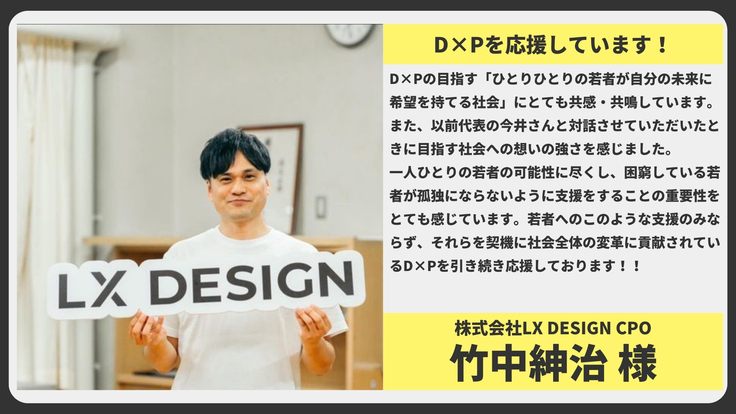 D×Pの目指す「ひとりひとりの若者が自分の未来に希望を持てる社会」にとても共感・共鳴しています。また、以前代表の今井さんと対話させていただいたときに目指す社会への想いの強さを感じました。