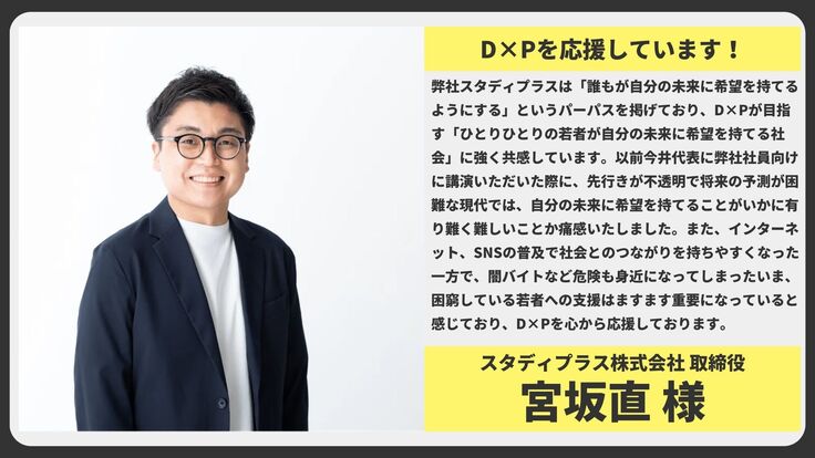 弊社スタディプラスは「誰もが自分の未来に希望を持てるようにする」というパーパスを掲げており、D×Pが目指す「ひとりひとりの若者が自分の未来に希望を持てる社会」に強く共感しています。以前今井代表に弊社社員向けに講演いただいた際に、先行きが不透明で将来の予測が困難な現代では、自分の未来に希望を持てることがいかに有り難く難しいことか痛感いたしました。また、インターネット、SNSの普及で