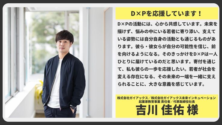 D×Pの活動には、心から共感しています。未来を描けず、悩みの中にいる若者に寄り添い、支えている姿勢には自分自身の活動とも通じるものがあります。彼ら・彼女らが自分の可能性を信じ、前を向けるようになる。そのきっかけをD×Pは一人ひとりに届けているのだと思います。寄付を通じて、私も彼らの一歩を応援したい。若者が社会を変える存在になる、その未来の一端を一緒に支えられることに、大きな意義を感じています。