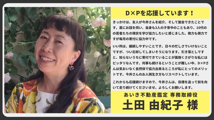 何事も続けるということが難しい中、D×Pさんは気おいなく自然体で協力出来るところが私にとってのメリットです。今井さんのお人柄生き方もリスペクトしています。これからも応援続けますので、今井さんは、目標を追って前を向いて走り続けてくださいませ。よろしくお願いします。