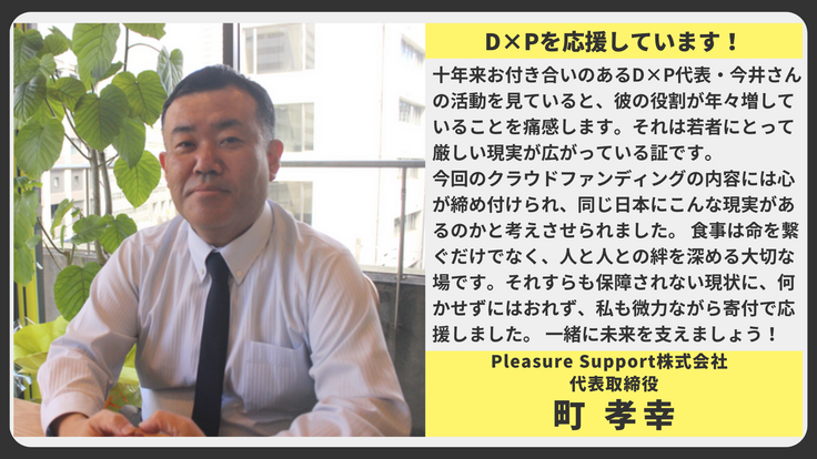 Pleasure Support株式会社 代表取締役 町 孝幸様から応援メッセージが届きました。ありがとうございます!