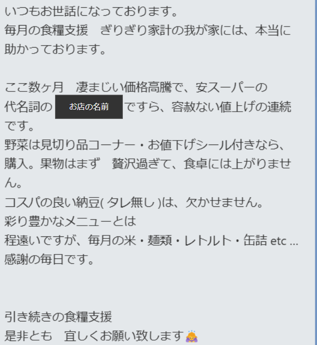 Aさんには、ユキサキチャットを通じて食糧支援を届けるとともに、生活の安定に向けて伴走しています。