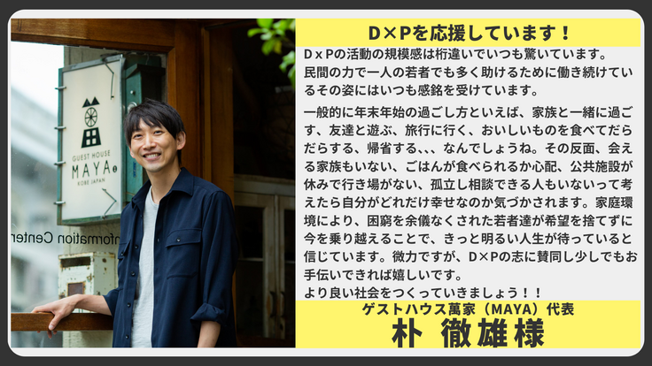 家庭環境により、困窮を余儀なくされた若者達が希望を捨てずに今を乗り越えることで、きっと明るい人生が待っていると信じています。微力ですが、D×Pの志に賛同し少しでもお手伝いできれば嬉しいです。