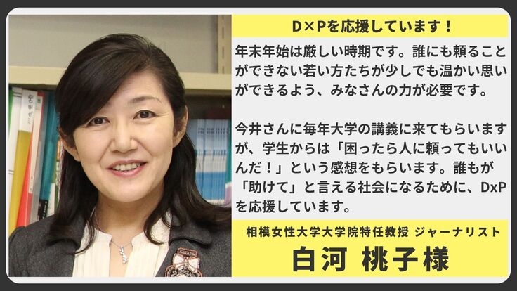 年末年始は厳しい時期です。誰にも頼ることができない若い方たちが少しでも温かい思いができるよう、みなさんの力が必要です。今井さんに毎年大学の講義に来てもらいますが、学生からは「困ったら人に頼ってもいいんだ!」という感想をもらいます。誰もが「助けて」と言える社会になるために、DxPを応援しています。