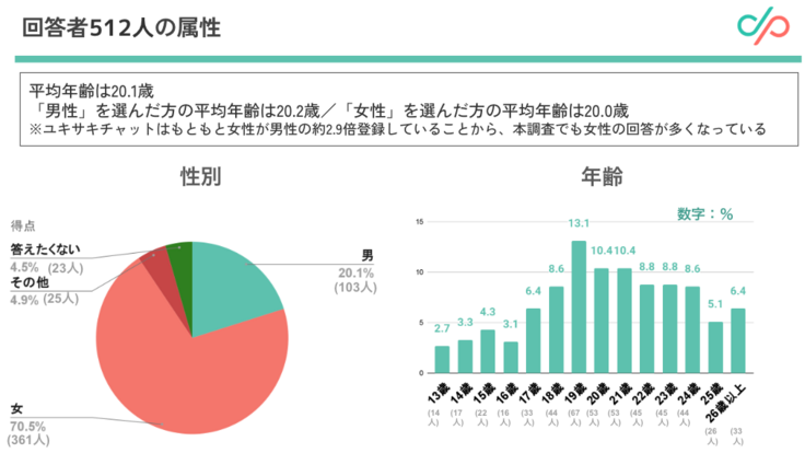 本調査の回答者の平均年齢は20.1歳であり、女性が男性の約2.9倍登録しているユキサキチャットの特性から、回答者も女性が多い傾向にあります。回答者の属性としては、58%が教育機関に所属しており、残りの42%は会社員、アルバイト、無職となっています。