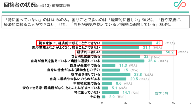 最も多い困りごとは「経済的に苦しい」(50.2%)であり、次いで「親や家族に経済的に頼ることができない」(42%)、「自身が病気を抱えている、または病院に通院している」(35.4%)が上位に挙がっています。このような結果から、回答を寄せてくれたのは経済的問題を抱え、かつ家庭からのサポートを得にくい状況にある若者が中心であることが推察されます。