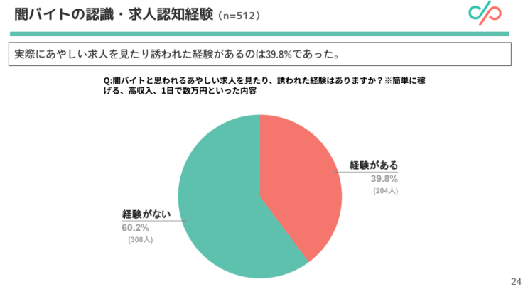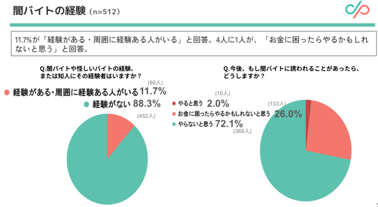 本調査は、D×Pが運営するLINEを使ったオンライン相談窓口「ユキサキチャット」の対象期間中利用者9,008名(回答数:512件 回答率5.6%)を対象に実施され、闇バイト経験の有無や認知度、検討理由、相談行動などについて調査したものです。