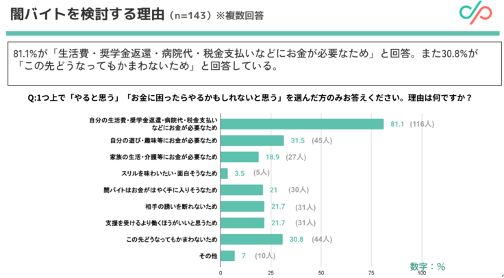 また、30.8%が「この先どうなっても構わないため」と回答しており、将来を絶望視している若者の心理状態が闇バイトを検討する背景にあるようです。