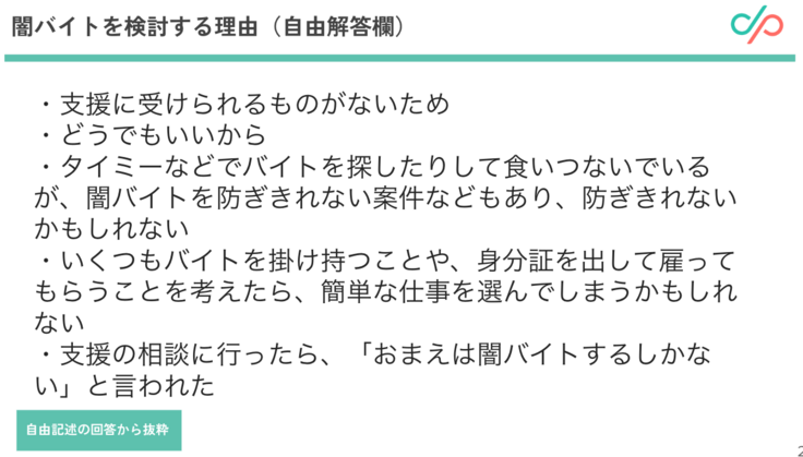 闇バイトはもちろん犯罪です。しかし、そうだとわかっていても手を出すことを考えてしまうほど、若者が困窮を深めていることも事実であり、私たちが目を向けるべきはそこだと考えています。