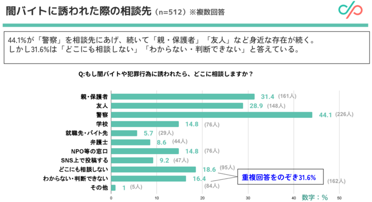 生活に困った際、約3分の1の若者が「即日でお金がもらえるバイトを探す」と回答しました。闇バイトに誘われた際の相談先として最も多かったのは「警察」(44.1%)でしたが、一方で、31.6%もの若者が「どこにも相談しない、分からない、判断できない」と回答しています。