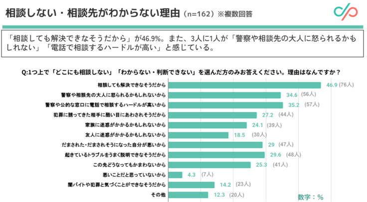 相談しない理由としては、「相談しても解決できなそうだから」(46.9%)が最も多く、若者が相談する前に諦めてしまっている状況が伺えます。また、「警察や相談先の大人に怒られるかもしれない」「電話で相談するハードルが高い」といったインサイトもありました。