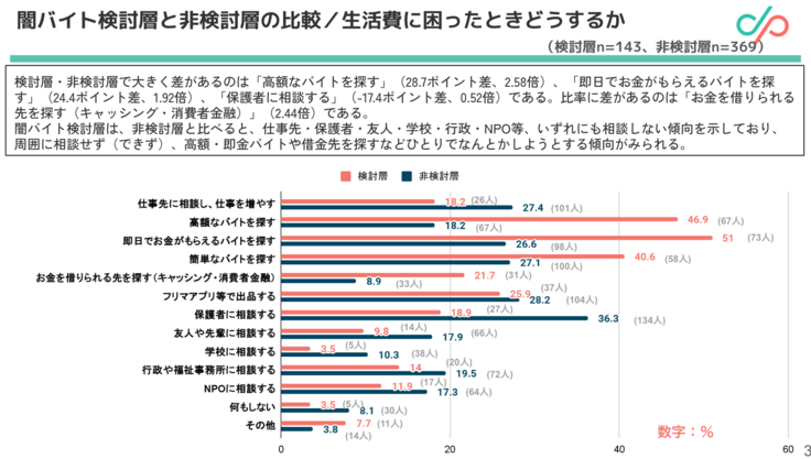 生活費に困った際の行動としては、検討層は非検討層と比較して「高額なバイトを探す」「即日でお金がもらえるバイトを探す」傾向が顕著であり、経済的な困難をすぐに解決しようとする切迫した状況が伺えます。