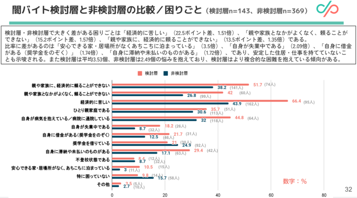闇バイトの検討層と非検討層を比較すると、検討層の方が「経済的に苦しい」「親や家族と仲が良くなく頼ることができない」「親や家族に経済的に頼ることができない」といった困り事をより多く抱えていることが明らかになりました。