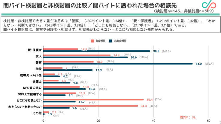 闇バイトに誘われた場合の相談先としては、検討層は非検討層に比べて「分からない・判断できない」「どこにも相談しない」と回答する割合が高く出ています。さらに、検討層は非検討層よりも闇バイトの求人を見たり誘われた経験、周囲に経験者がいる割合が高いことも明らかになりました。