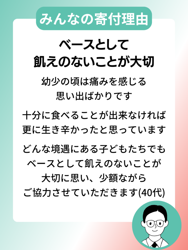 「どんな境遇にある子どもたちでも、飢えのないことが大切」と、ご支援いただきました。