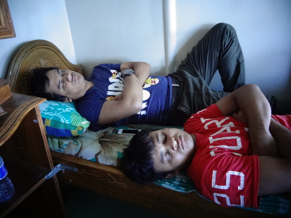 (写真:ダッカに向かう船の中で。疲れ果てて寝ているんですが、同じ格好・同じ表情しています。)