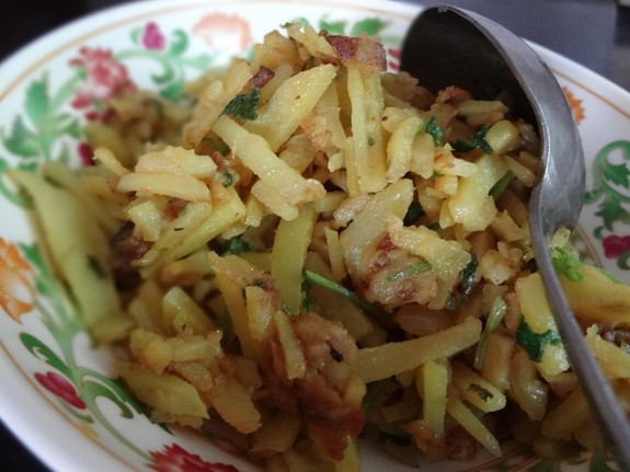 まずはポテトの炒め物。これは朝ごはんに食べます。パクチとポテトが絶妙!