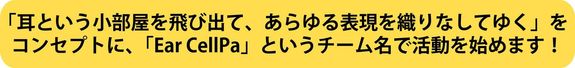 チーム名には、「イヤー(耳)」「セル(小部屋)」「パ(破裂音)」この3つで、「耳という小部屋を飛び出て、あらゆる表現を織りなしてゆく」という意味が込められております。この由来を基に、私たちは難しいと思うことを、出来ると信じて挑戦していきたいです。