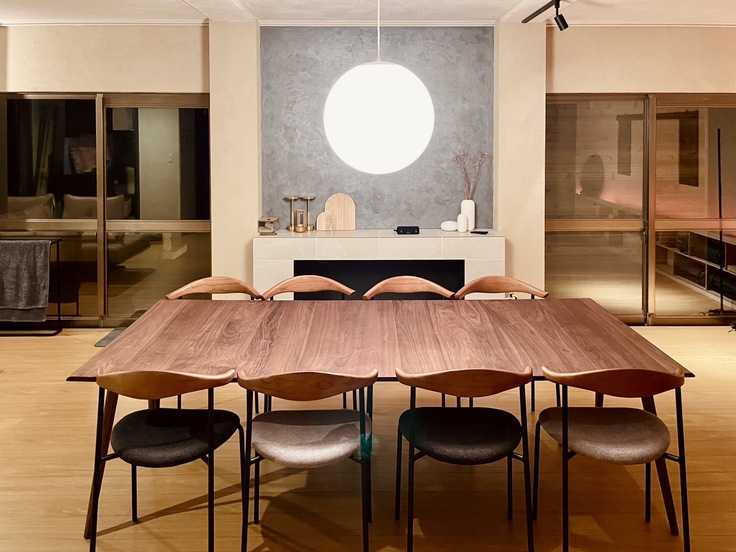↓エタノール暖炉(中央奥)のあるダイニングの写真