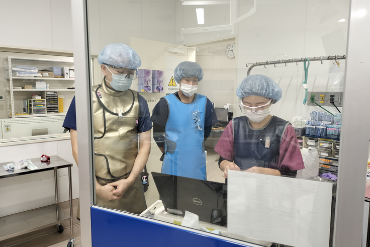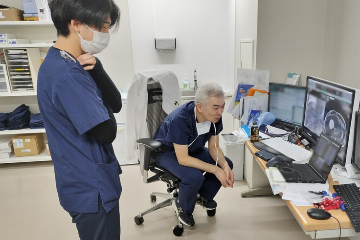 ▲吉田医師と放射線技師が検査の合間にライブデモンストレーションを観て勉強しています。