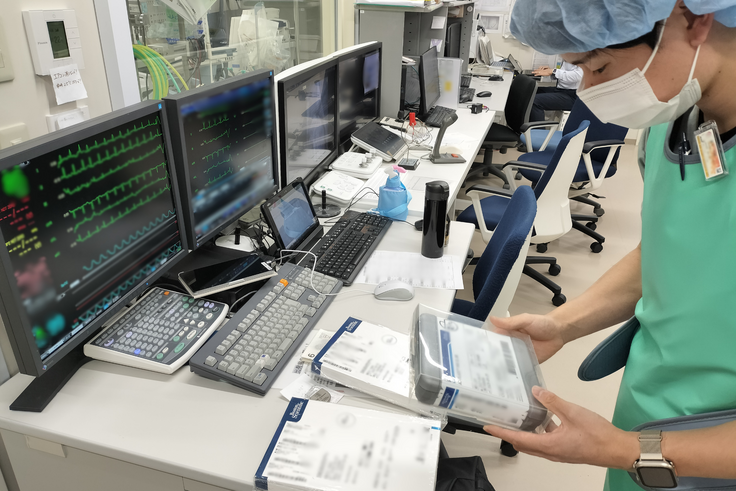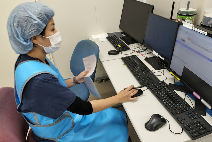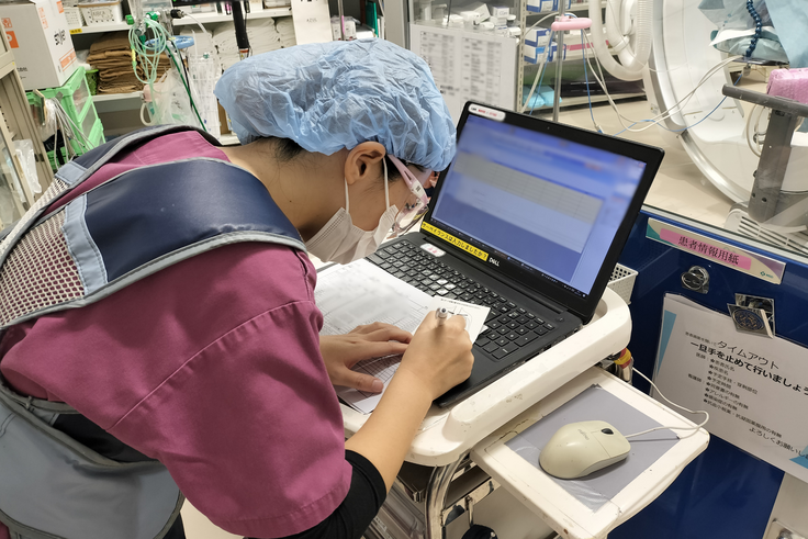 ▲ペースメーカー留置をする患者さんのカルテから情報を拾い、患者登録をしているところです。