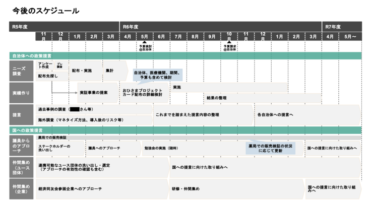 今後は国会議員・厚労省・政策提言アドバイザーなど、様々なステークホルダーと連携を行いながら、どんな情報があれば自治体内での調整がしやすいのか、仕組みとして受け入れやすいのかなど、4月からの政策提言に向けての準備を進めています。