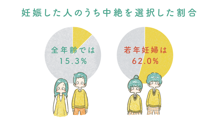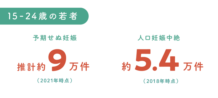 2019年の調査では、日本に住む24歳以下の若者の予期せぬ妊娠の件数は、約9万件(※3)です。さらに、2018年時点で、同じく24歳以下の若者が行った人工妊娠中絶の件数は約5万4,000件(※4)です。