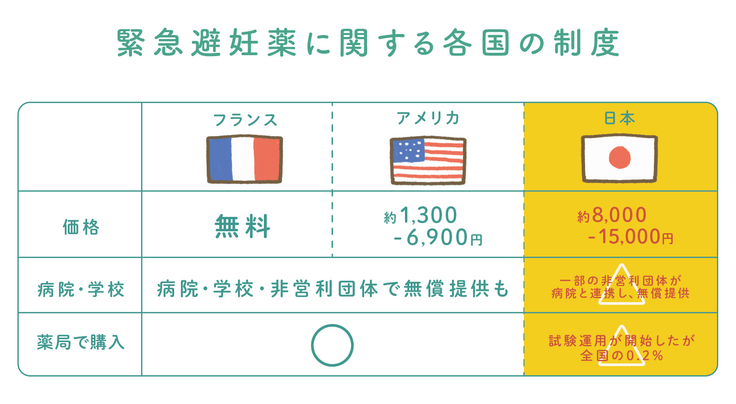 ※1:2023年12月現在、緊急避妊薬の薬局での試験販売が行われています。この場合の販売価格は7,000~9,000円ですが、本ページでは病院での販売価格を記載しています。