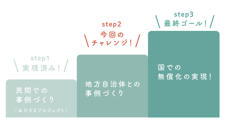 一方で、私たちの最終目標は、2027年までに「おひさまプロジェクト」を国の仕組みにして、社会のシステムチェンジをすることです。つまり今回のクラウドファンディングでは、継続実施に加えて地域・国の仕組みにするための働きかけを進めていくための活動資金を募ります。私たちの最終目標は、2027年までに「おひさまプロジェクト」を国の仕組みにすることです。この目標を達成するためのステップは以下の通りです。