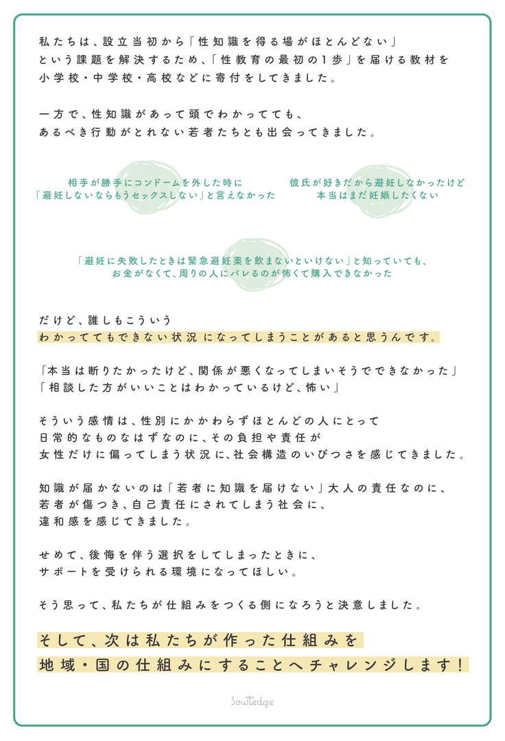 ソウレッジは、誰もが安全に暮らせる社会を目指し、若者の予期せぬ妊娠や性暴力などの性にまつわる課題に向き合い、根本的な課題解決を目指す活動をしています。 当たり前の学生生活や、自分がやりたかったこと、なりたかったもの。 そのどれもが性暴力や妊娠によって奪われることがないように。 教員への研修、避妊具の無償化に向けた政策提言、無償提供するための基金の設立、活動の幅を限定せずさまざまな取り組みを行っています。