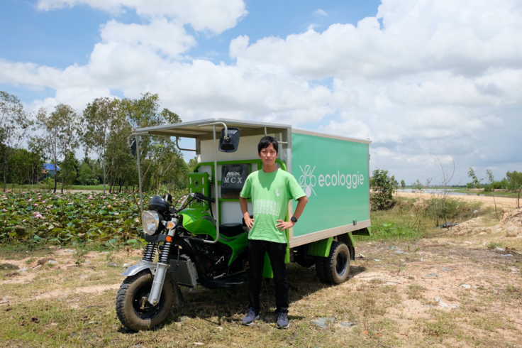 エコロギーのタケオ拠点では、エコロギーのロゴマークを付けた全身緑のトゥクトゥクが走っています。