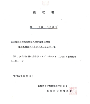 ・矢作川水源の森購入費378,000円(根羽村へ送金)