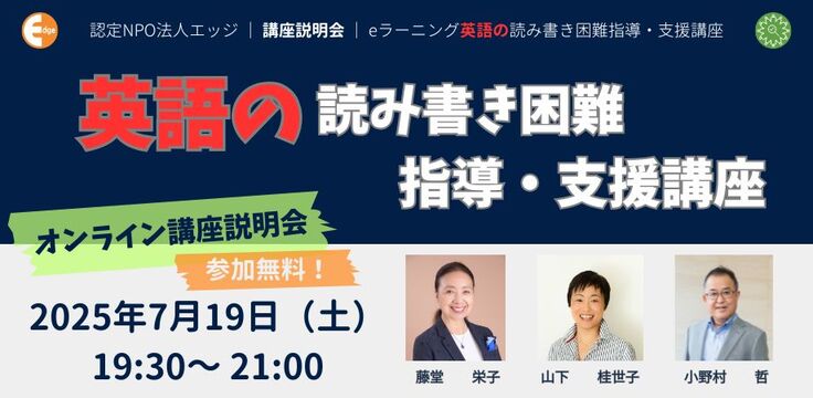 エッジでは、山下桂世子先生、小野村哲先生、藤堂栄子(イントロダクション)によるeラーニング「【英語の】読み書き困難指導・支援講座」を7月に新開講いたします。