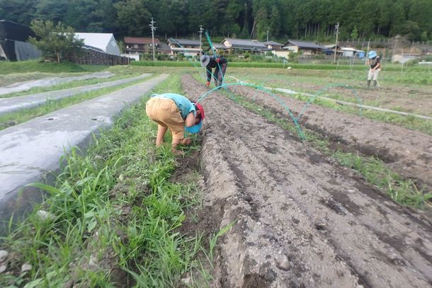 (人参の種まきの後にかける遮光ネット用のトンネル作りのお手伝い)
