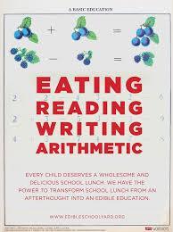 このポスター、エディブル・スクールヤード・バークレーが作ったもので、活版印刷という昔ながらの技術で作られています。菜園やキッチンでは、国語も算数も、社会科も理科も、すべての必修科目とクロスできる教材の宝庫だよ、と知らせています。学びの中心に「食べること」を、アリス・ウォータースのメッセージです。
