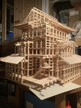 天守の骨組の構造がよくわかるはずの軸組模型でもこれだけ軸が重なると内側が隠されてしまいます。そこで、四つのうち一つの角を切り取って、そこから内部を覗けるようにしました。