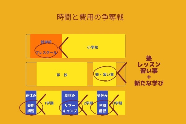 現実的には、学校、習い事、運動、遊び、家族団欒など、どこかの時間を削減します。