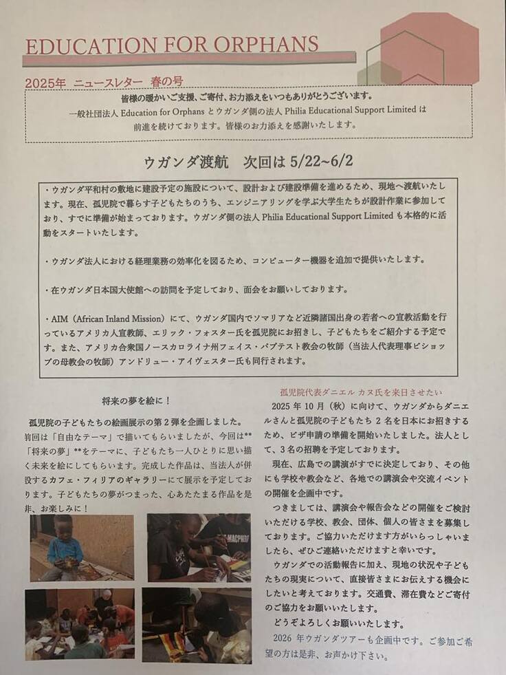 フィリア友の会 教育支援センター応援ファンド 法人の活動費、経費、維持費全体の支援です。スタッフのウガンダ渡航費も含む