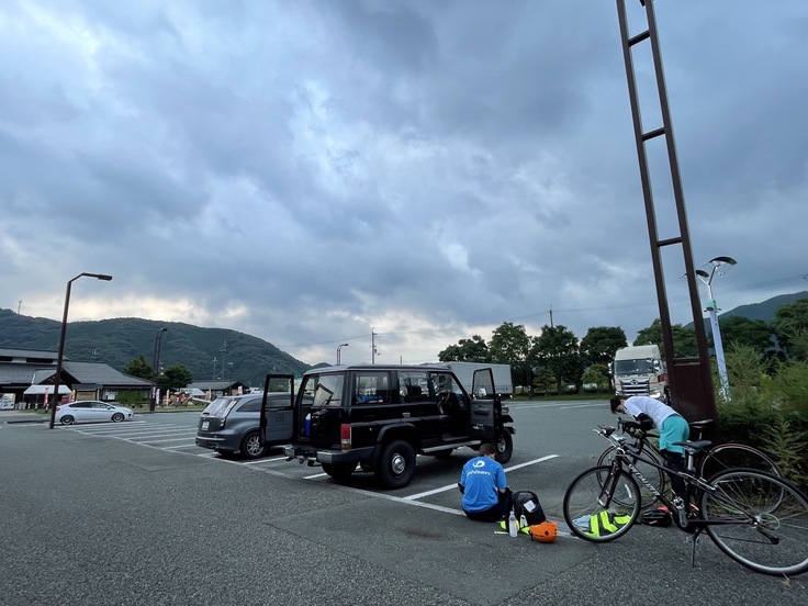 しばらく走ってちょうどよく道の駅。少し長めの休憩で朝食を取ります。前日の教訓を活かし、パン、バナナ、羊羹、ゼリーなどをお腹に溜め込むスタッフ。