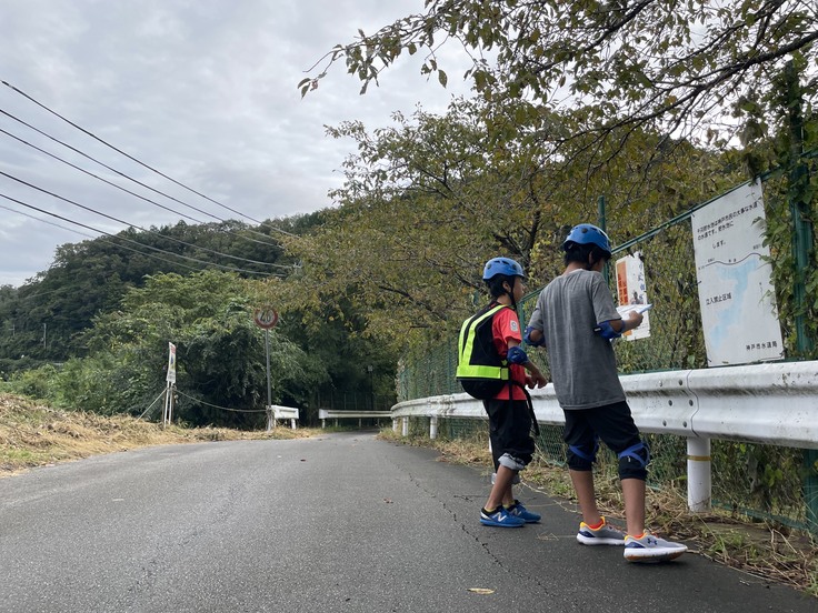 現地にある周辺案内マップと自分達の地図を見比べながら現在地や進行方向を確認しています。どの道に進か、どちらが先頭を走るか…2人の中でたくさんの葛藤があったようです。