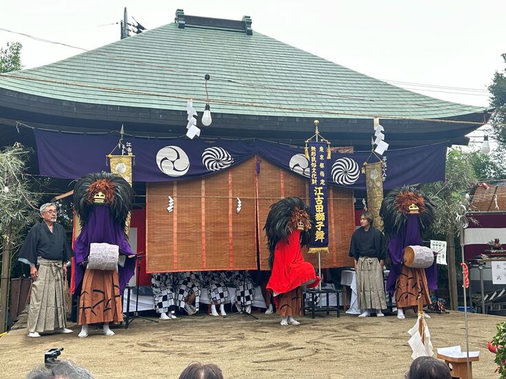台風23号の接近に伴う降雨のため、例大祭前日の江原町でのお練り行列は中止になってしまいましたが、お祭り本番は関係者の願いが通じたのか雨が上がり、薄日のお天気になりました。午前7時より花山車の装飾を行った後、関係者は衣装をまとって各町会の集合を待ちました。正午に獅子のお練り行列は出発、新青梅街道にて華やかな練り歩きを行いました。