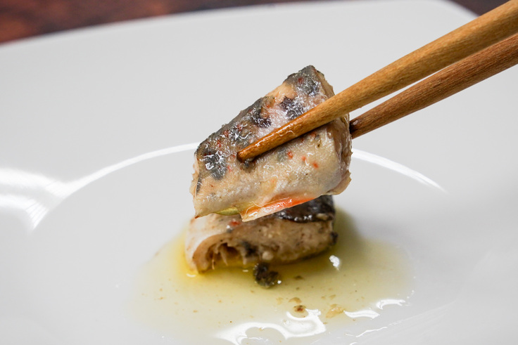 ▲現在開発中のアマゴのアヒージョの缶詰の試作品