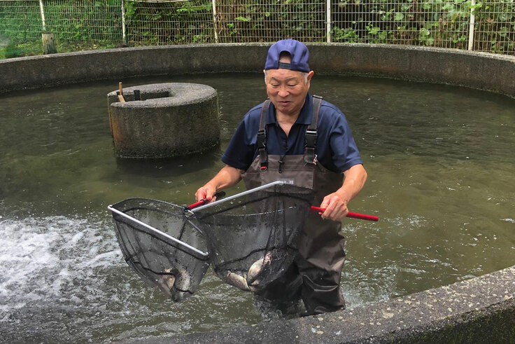▲滑床養魚場でアマゴの養殖を行う竹内義富さん